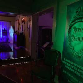 Haunted OC hosted an exclusive $650 a plate dinner on Friday September 13th for 13 guests at the historic 1930’s era Disney mansion in Los Feliz, CA. The meal was served on an exact replica of the Haunted Mansion banquet table from the Disneyland attraction. This was one of several events produced by Haunted OC to celebrate the 50th anniversary of the beloved attraction and featured guest of honor, Legendary Disney Imagineer, Bob Gurr, designer of the Doom Buggy.